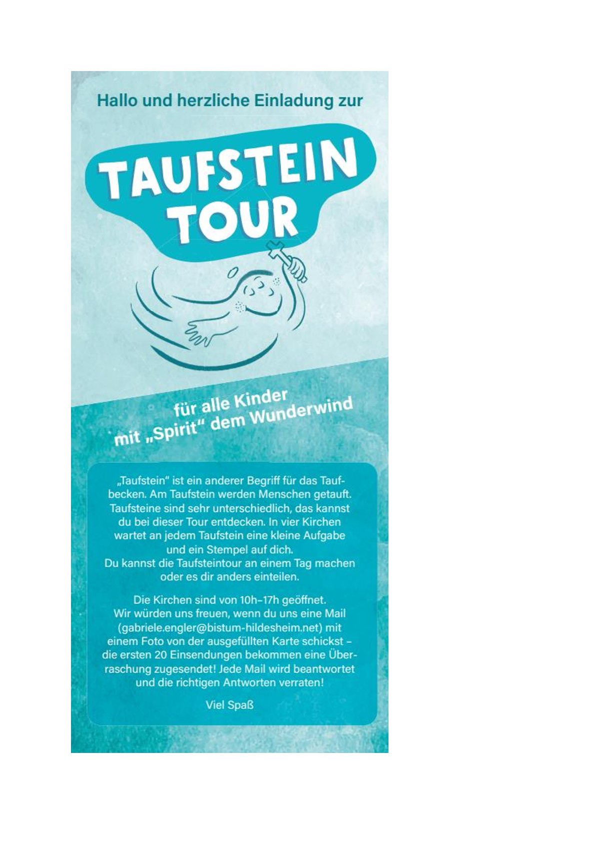 Besonders spannend: Die ersten 20 Einsendungen einer vollständig gestempelten Karte erhalten eine Überraschung per Post. Einfach ein Foto der Karte an gabriele.engler@bistum-hildesheim.net senden und von „Spirit“ beschenkt werden!