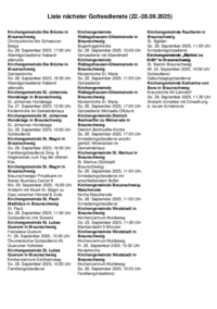 Liste nächster Gottesdienste (22.-28.09.2025) Kirchengemeinde Die Brücke in Braunschweig Christuskirche Am Schwarzen Berge So. 28. September 2025, 17:00 Uhr Abendgottesdienst Nabend allerseits…